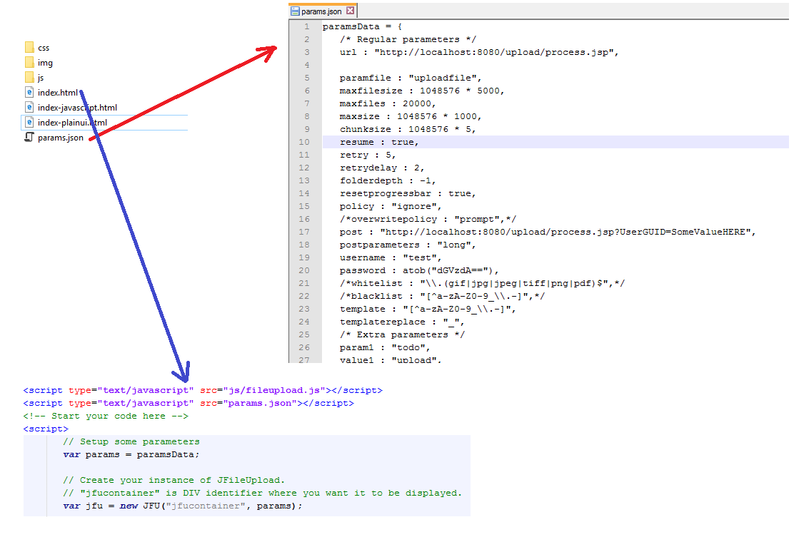You can move JBatchUpload HTML5 parameters in an external file: